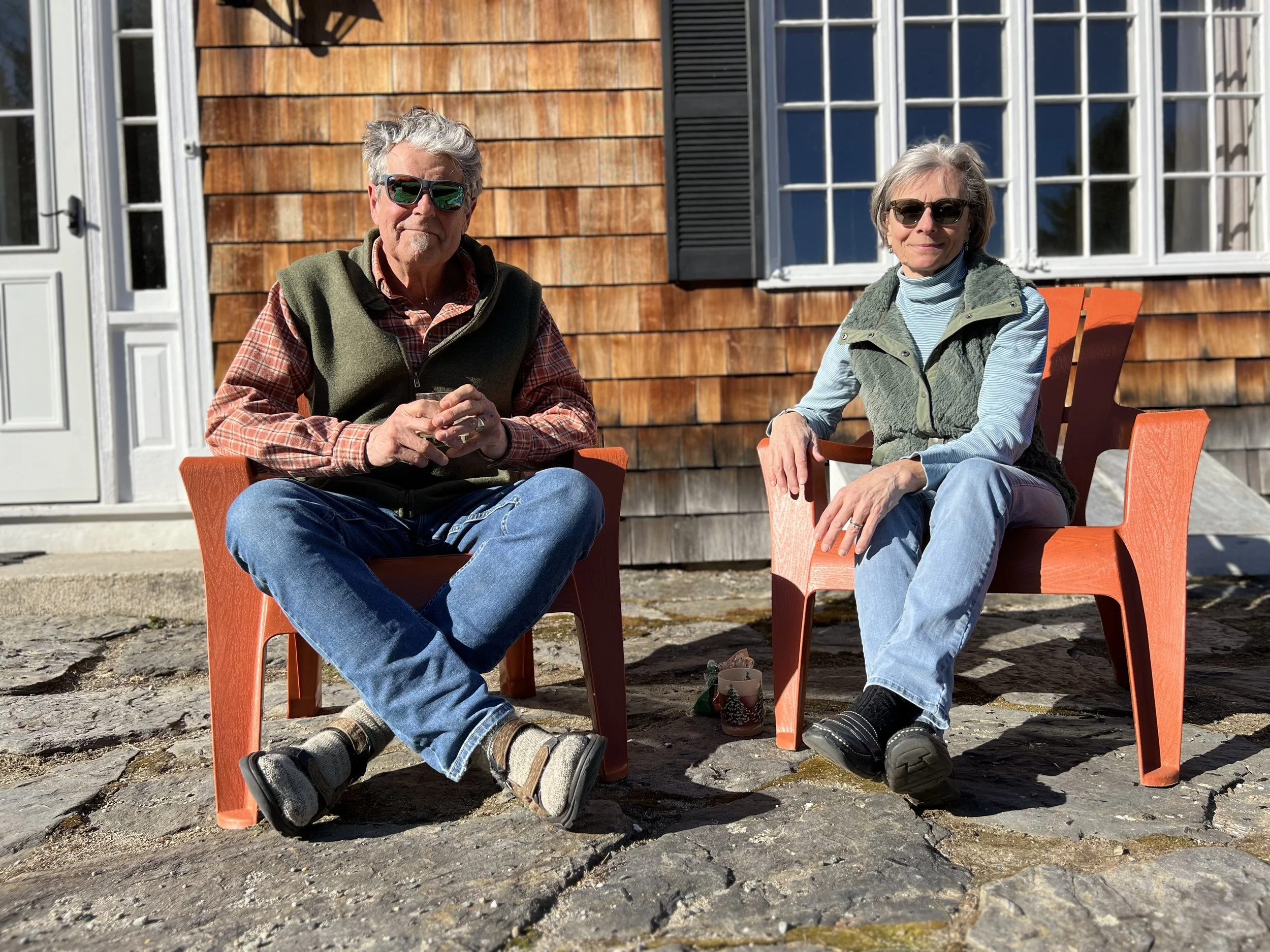 Julie & Greg Anthony relaxing on the Hilton patio after spring skiing corn snow on Easter 2023